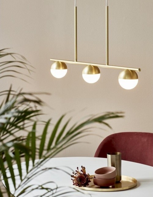 Ekskluzywna podłużna lampa wisząca z serii Contina marki Nordlux składa się z trzech niewielkich kloszy o sferycznym kształcie.